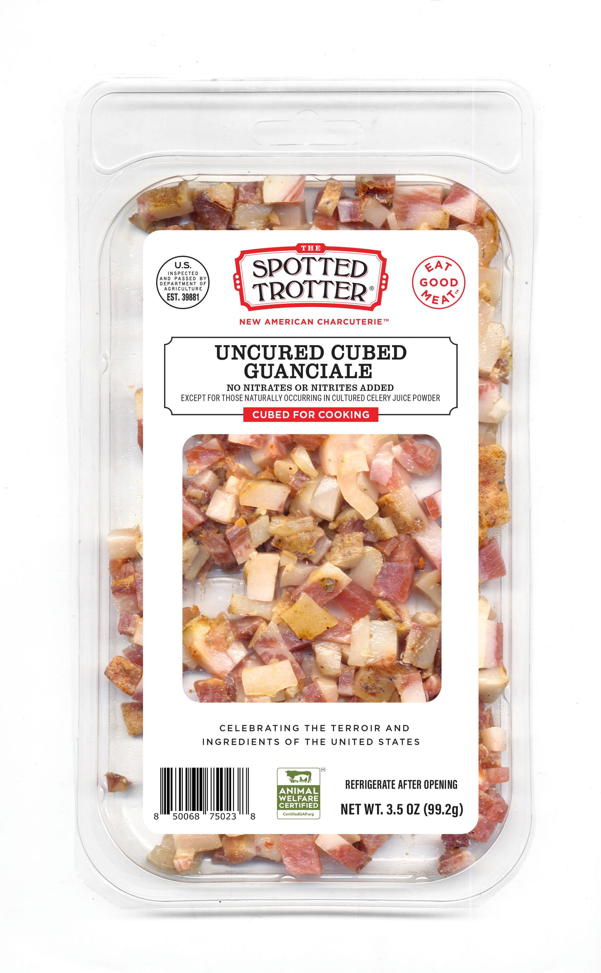 A Classic Old World Italian Whole Muscle Fat cut into lardons for cooking or Seasoning. Marinated in Fresh Herbs, Sea Salt and covered in Orange Zest, it is then slowly cured and dried for 6 weeks in our curing cave. This Diced Pork Jowl is classically used in Carbonara and can be used for Pizza, Pasta, or Sauces and pairs wonderfully well in all cooking that requires an authentic buttery pork richness to the dish. You can pair this buttery richness with big bold Chianti and Borollos for the win!